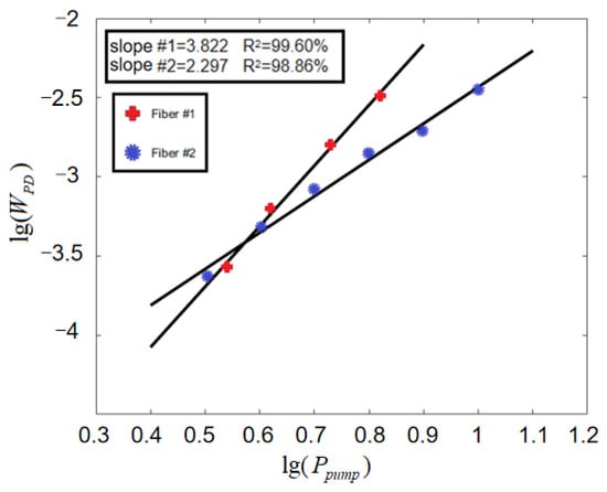 According to Formula (4), the is positively proportional to the high-energy photon power in the core. The logarithmic coordinate curve between the and the pump power (920 nm) is shown in Figure 4, in which the discrete points are the experimental data and the straight lines are the fitting curve.