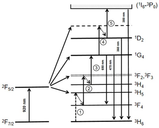 When the pump power is low, the linearity of the logarithmic relationship between and is poor, and the deviation between the experimental data and the fitting curve is large. When the pump power is high, the logarithmic relationship between them tends to be stable, and the linearity gradually appears. The analysis shows that when the power is low, the particle number distribution in the fiber is complex and various multiphoton processes will occur. When the power is high, the particle number distribution is gradually stable, and the energy transition channel is also stable. Therefore, we only fit the data obtained under the condition of the high-power pump (>3.2 W). The slope of the logarithm curve of of Fiber #1 and Fiber #2 under higher is 3.822 and 2.297. Since the is directly proportional to the participating in PD according to Formula (4), the is directly proportional to the 3.822 and 2.297 powers of the in Fiber #1 and #2, respectively. Therefore, the PD of Fiber #1 can be interpreted as a four-photon process. Figure 5 is a simplified diagram of Yb3+ and Tm3+ energy levels in fiber.