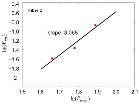 Since the Tm3+ concentration of Fiber D is one order of magnitude higher than that of other sample fibers, a great upconversion phenomenon occurs in the fiber, and the slope of the logarithmic curve of versus of Fiber D is 3.068. Therefore, the PD phenomenon of Fiber D can be explained as a three-photon process. Figure 7 is a logarithmic diagram of optical Fiber D. The of Fiber D at the power of 46, 60, and 79 mW is 0.02544, 0.04277, and 0.1328 s−1, respectively. In addition, since almost no photodarkening occurs below the pump power of 17 mW, this set of data are abandoned in plotting. According to the above data, when the pump power of the Fiber D experiment is much lower than that of other fiber experiments, is also much higher than that of other fiber experiments. Therefore, we speculate that because the Tm3+ concentration of Fibers A–C is too low, it is difficult for high-energy photons to be generated by upconversion of pump happening in Tm ion, and the light involved in PD is 488 nm probe laser rather than 1.12 µm pump laser. Furthermore, the probe power is very low (2 µW), which just explains the of Fiber D is much higher than that of Fibers A–C.