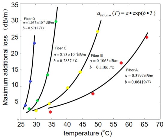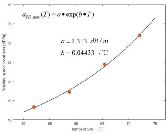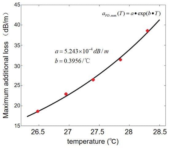 We digitized their experimental data, and converted them into the additional loss of the sample fiber (1 m) at different , and fitted it with Formula (11), as shown in Figure 9. We also found that is directly proportional to (Figure 10).