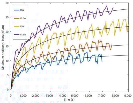 Through the experimental device, we obtained the curve of additional loss with time under different power levels (Figure 13) and fit it with Formula (11).