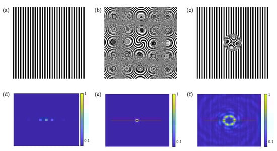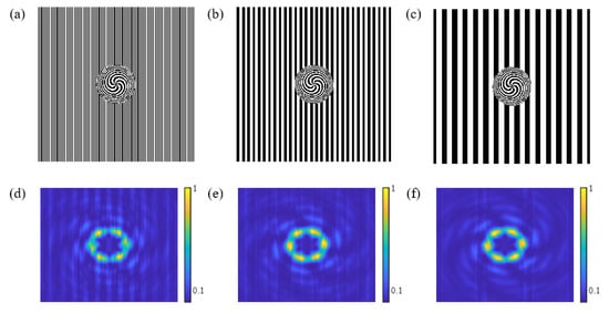 Figure 8a–c show the schematic diagrams of three CSZPGs with d = 100 μm, 400 μm and 800 μm, respectively. Figure 8d–f show the simulated normalized intensity profiles of the propagating CSZPG beams corresponding to Figure 8a–c, respectively. It can be found that the intensity of the vortex is proportional to the period compared with the patterns in Figure 8d,e. We can attribute this phenomenon to the fact that the dispersion ability of the grating becomes weaker corresponding to the increase in the period, which makes the diffraction intensity concentrate in the region of the vortex. However, when the period is very large, such as 800 μm, the dispersion of the grating is extremely weak, and the intensity profiles are approximately same as those seen in Figure 8e,f.