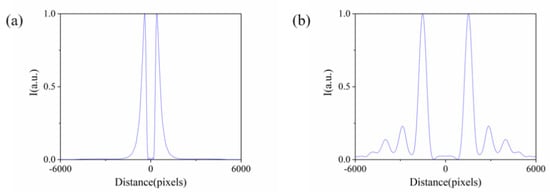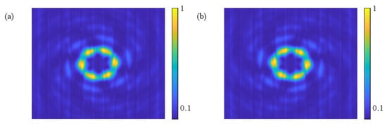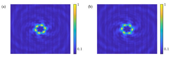 The simulated normalized diffraction patterns at the position of (a) z = 230 mm and (b) z = 270 mm.
