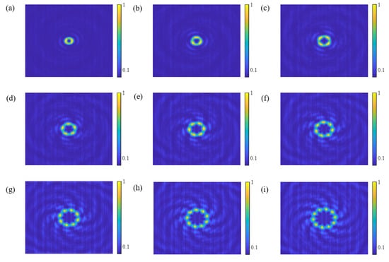 Figure 4a–i show the transverse diffraction patterns of the propagating CSZPG beams at the location of z = 250 mm with topological charge l = 2, 3, 4, 5, 6, 7, 8, 9 and 10, respectively. It can be clearly seen that the CSZPG generates flower mode vortices with 2, 3, 4, 5, 6, 7, 8, 9 and 10 petals which is same with the topological charge. Since the radius of the vortex increases as the topological charge increases in the SZP [], the CSZPG composed by the inner SZP and the outer grating also follows this principle, and the region of the flower mode vortices gradually increases with the increase in the topological charge. Additionally, the spiral directions outside the central petal are reversed when the TCs are different signs in Figure 5, but the flower mode vortices are approximately the same. Thus, the CSZPG composed by the inner SZP and the outer grating can generate flower mode vortices, and the number of petals coincides with the topological charge of the corresponding SZP.