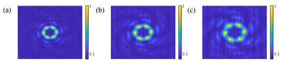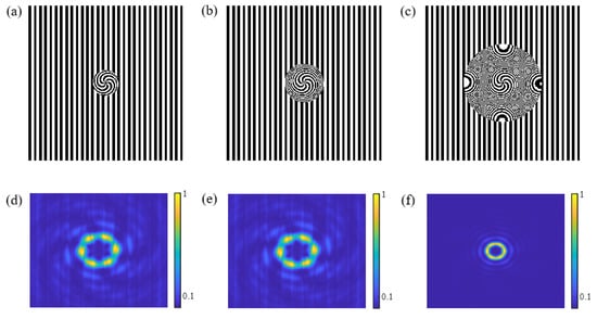 Focal length of the CSZPG determines the focused position, and the intensity distribution in different focal lengths has some differences. For example, Figure 9a–c show the intensity distributions of the CSZPG by combining the SZP and the grating with the parameter of f = 200 mm, 250 mm and 300 mm, respectively. It is clearly seen that the intensity profiles of three CSZPGs are different. As the focal length increases from 200 mm to 300 mm, the vortex size also gradually increases. The main reason is that the dispersion characteristic of the grating exists in the CSZPG. The distance between different grating orders increases along the direction of propagation. So, for the CSZPG with the bigger focal length, the vortex size will be larger in the observed plane.