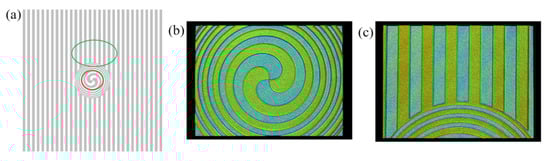 The designing process of the CSZPG is shown in Figure 1. The spiral zone plate and the grating with parameters of f = 250 mm, d = 400 μm and l = 6 are shown in Figure 1a and Figure 1c, respectively. The filter with the parameter of R = 1500 μm is shown in Figure 1b. The structure shown in Figure 1d is inversed with the filter in Figure 1b. The inner spiral zone plate by multiplying the spiral zone plate and the filter in Figure 1a,b is shown in Figure 1e. The outer grating by multiplying the grating and the inverse filter in Figure 1c,d is shown Figure 1f. The designed CSZPG composed by the inner spiral zone plate and the outer grating is shown in Figure 1g.