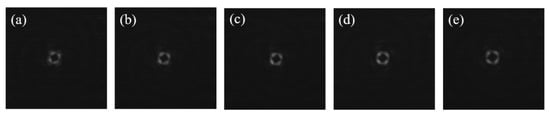 Finally, we research the diffraction patterns of the design element away from the focal length. So, we measured the images of the CSZPG located at the positions of z = 230 mm, 250 mm and 270 mm in Figure 14b–d, respectively. It can be seen that the intensity and the size of the flower mode vortices generated by fabricated CSZPG at different positions are approximately the same. In addition, the shapes of the beams are well preserved at the positions of z = 220 mm and 290 mm in Figure 14a,e. Thus, the experiments show that CSZPG can achieve the long focal depths.