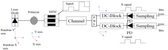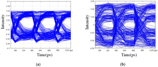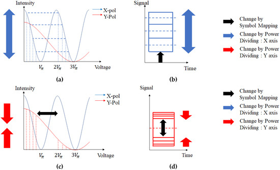 Figure 2a,c show that the transfer curve of each polarization is different. Thus, different intensity signals can be modulated for each polarization by using the same voltage signal. If the eight-voltage point is set as the input symbol voltage, as depicted in Figure 2a,c, then the intensity of each polarization is modulated differently due to the birefringence of MZM. By adequately tuning the bias and points, one axis can be modulated as PAM4, and the other axis can be modulated as OOK. Figure 2b,d depict the expected eye diagrams of each polarization. In this case, the eight-voltage point is just an example. The modulation order could also be adjusted arbitrarily. MPAM could be modulated in the X-axis, and OOK could be modulated in the Y-axis.