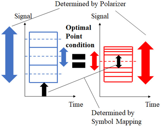 where refers to the polarization dividing ratio and refers to the intensity. Therefore, if one voltage signal (symbol mapping) and are determined, and are automatically determined by Equation (8). If the MZM has an ideal cosine curve, the optimal point is determined as shown in Figure 4.