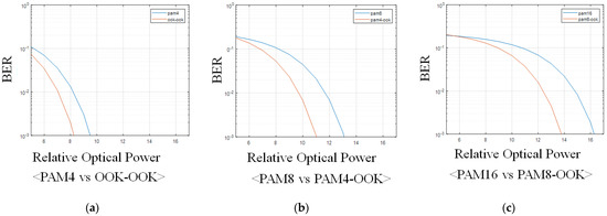 Relative optical power vs. BER graph for the proposed technique and MPAM. (a) PAM4 vs. OOK–OOK; (b) PAM8 vs. PAM4–OOK; (c) PAM16 vs. PAM8–OOK.