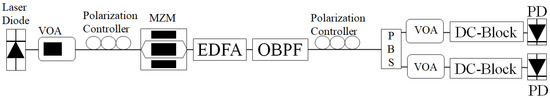 Based on the above theories, an OOK–OOK experiment in a commercial MZM was conducted as a proof-of-concept. Figure 6 shows the overall experimental scheme. However, because the MZM in the laboratory had an internal polarizer to decrease the Y-axis power for MZM performance, the experiment could not be conducted under optimal power-dividing conditions. Therefore, more power was allocated to the Y-axis and amplified by the EDFA. In addition, the RF amplifier in the laboratory had a limited range; thus the experiment could not be conducted under the optimal 3 condition depicted in Figure 3. Therefore, the experiment was conducted within range. A 2.5 Gbps experiment was conducted for each axis with a back-to-back system.