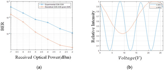 The received optical power vs. BER graph for theoretical OOK–OOK and experimentally measured OOK–OOK is depicted in Figure 8a. In this graph, the received optical power is the total received power of each axis. The theoretical value is the simulated BER when the voltage swing is in a range for the given noise power. It can be seen that the measured OOK–OOK performance is less than the theoretical value. This is because, as mentioned above, the experiment could not be conducted under optimal conditions owing to the internal polarization of the MZM in the laboratory and the limitations of the RF amplifier. The measured voltage-intensity transfer curve for each axis is shown in Figure 8b. It can be observed that the Y-axis transfer curve is not an ideal transfer curve. This limits the performance of the proposed technique. However, these were all experimental errors. If the experiment is performed under optimal conditions, modulation with a higher spectral efficiency can be conducted with a single MZM.