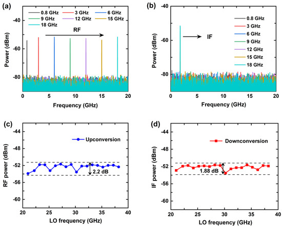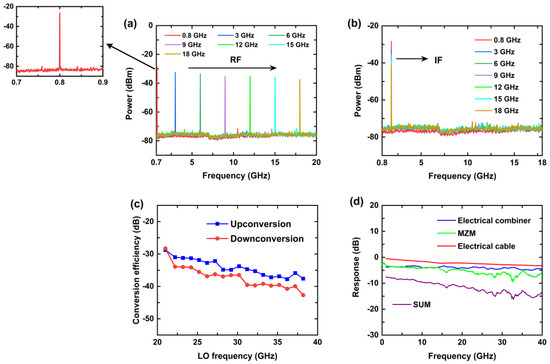 | This paper | Both upconversion and downconversion | Around −35 dB | Good (spurious suppression > 40 dBc in the whole in-band) | CS-DSB | MZM | 0.8–18 GHz |