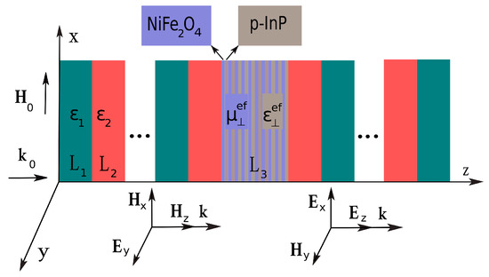 Let us consider a symmetrical MCR formed by two Bragg mirrors (BMs) and a cavity separating them. The period of the BMs consists of two layers of isotropic dielectrics with permittivity and and equal optical thicknesses . The cavity, the length of which and the permittivity , will be filled with a magnetically active flat-layered structure, composed of semiconductor and ferrite layers with thicknesses and (see Figure 1). The material parameters (permittivity and permeability of each of the layers) in the studied high-frequency range are scalar-tensor quantities, i.e., for a semiconductor, this is and , for a ferrite, and . In the absence of an external magnetic field, such one-dimensional structure has the properties of the uniaxial crystal with symmetry axis perpendicular to the interfaces between the layers ( axis). A plane linearly polarized wave is introduced into the structure along this axis and propagates in it.
