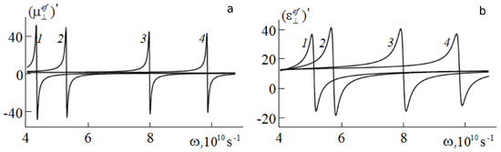 Frequency dependences of the real parts of the effective permeability (a) (controlled TE wave) and permittivity (b) (controlled TM wave) of a finely layered structure at (curves 1–4) at .
