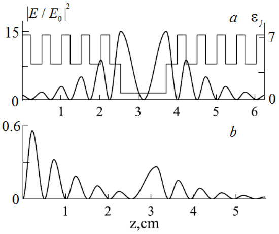 Figure 3a,b shows the distribution over the MCR structure of the normalized electric field squared modulus for different cavity sizes. The operating frequency, for which the distribution of the electric field amplitude is constructed, corresponds to the frequency of the central mode . The thin line shows the distribution of the permittivity along the longitudinal coordinate of the MCR. It can be seen that, for the structure with (a) at its center, the electric field amplitude reaches the minimum, and two maxima occur at the side boundaries of the cavity. In this case, the amplitude of the magnetic field in the center of the cavity reaches the maximum, and at its boundaries with BMs, it reaches the minimum. The incident wave weakly penetrates into the structure, since at the chosen operating frequency the cavity plays the role of a reflecting quarter-wave plate; this follows at (b) from the field distribution.
