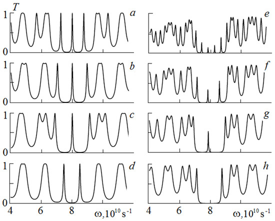 Transmission spectra of the MCR with the vacuum cavity (a–d) and the cavity filled with a finely layered ferrite-semiconductor medium (e–h) with the thickness ; cm at .