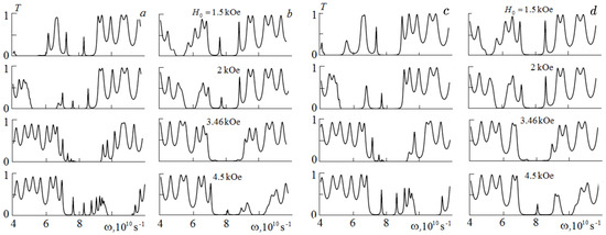 Figure 5 show the transmission spectra of TE (a,c) and TM (b,d) waves of the MCR filled with an effective medium for two cavity sizes (a,b) and (c,d), at magnetic field values (curves 1–4). It can be seen that, as the field increases, the character of the frequency dependence of the transmission coefficient changes significantly and depends both on the thickness of the effective medium and on the type of the incident wave.