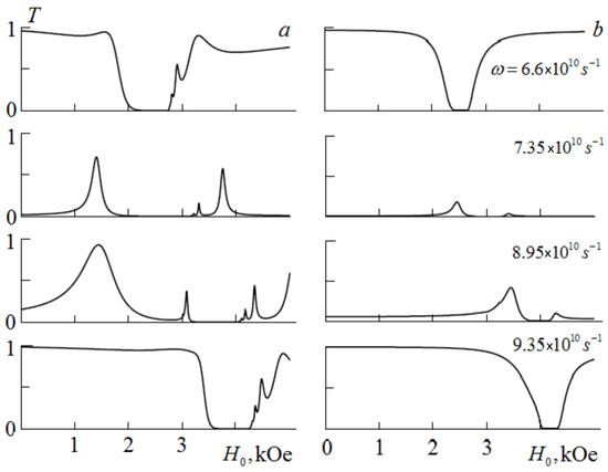 Figure 6 shows the external field dependences of the TE and TM waves (a,b) transmission coefficient at several frequencies and size for an MCR with the cavity filled with an effective medium. It can be seen that for some frequencies there are fields’ intervals where the transmission of waves of both polarizations is almost complete, and there are intervals where the wave transmission is complete only for one polarization. The presence of such intervals in the spectrum makes it possible to use a structure similar to a MCR as a filter or polarizer controlled by a magnetic field.