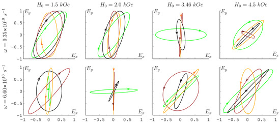Figure 7 shows the polarization ellipses of the wave transmitted through the structure, obtained with the orientation of the plane of the wave incident polarization on the structure , at two frequencies and four values of the parameter (green, black, brown, and yellow lines, the arrows indicate the direction of vector motion). It can be seen from the shape of the polarization ellipses that both the magnitude of the ellipticity and the angle of inclination of the major axis depend significantly on the frequency, on the applied magnetic field, and on the ratio of the layer thicknesses in the structure period. Therefore, these parameters of the wave passing through the MCR are easily controlled within a fairly wide range.