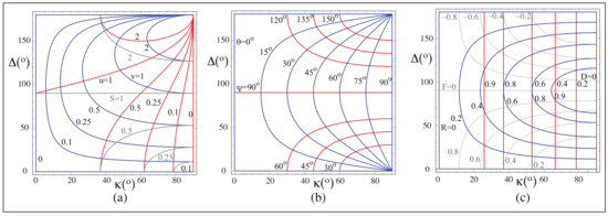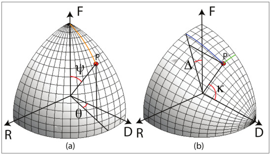 so that lines of constant are orthogonal sets of circles on the generalized retardation sphere, passing through the point , and inclined at angles , respectively, to the F axis, as illustrated in Figure 2. We have