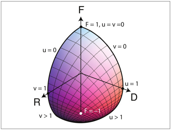 The representation of the transformation given by an homogeneous retarding diattenuater on the generalized retardation sphere, a portion of an analogy to the Poincaré sphere. (a) Polar coordinates aligned on the F-axis; (b) polar coordinates aligned on the D- axis The Cartesian coordinates and are the diattenuation and the retardation, . The coordinate , , is a measure of the strength of the polarization transformation, with the point corresponding to no change, and the circle to a quarter-wave retarding diattenuater. The point (not shown) corresponds to a half-wave retarder.