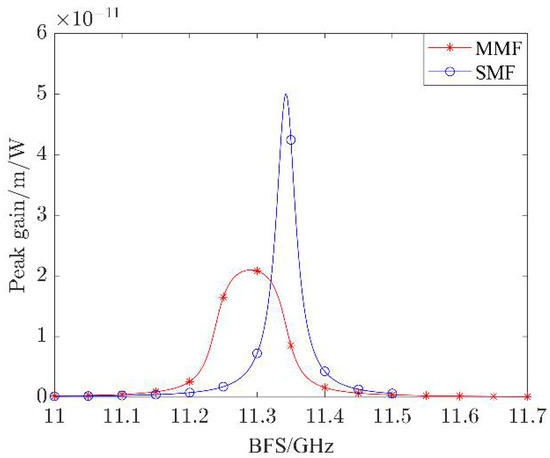 where g0 is the Brillouin gain coefficient of SMF, v is the frequency shift value, vB0 and vBc are the on-axis (maximum) and critical angle (minimum) BFS, respectively. ΔvBS is the BGS linewidth of SMF, ϕ is the backward Stokes angle, θc is the complementary angle of the critical angle, NA is the numerical aperture, and n0 is the refractive index of the MMF core. The Brillouin gain spectra of MMF and SMF are illustrated in Figure 1. It can be seen that the BFS of the MMF is smaller than that of the SMF, which is caused by the different light incident angles and scattering directions. Moreover, multiple Brillouin-gain spectra exist in the MMF, resulting in a relatively wider BGS and a smaller Brillouin-gain coefficient (2.096 × 10−11 m/W).