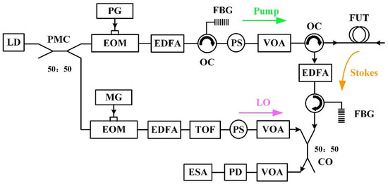 Figure 5 shows a self-built frequency-shift local heterodyne BOTDR sensor, which was used to evaluate the ISNR of the sensing structure with the SMF alignment fusion to the 50 μm GI-MMF compared to the standard SMF. A polarization-maintaining coupler (PMC) with a splitting ratio of 50:50 splits the light from LD into two branches, a pump and a local oscillator (LO). An electro-optic modulator (EOM) driven by a pulse generator (PG) is used to modulate the amplitude of the light from the LD to generate a 130 ns pulse with a repetition rate of 16 kHz. The pulse light is amplified by an erbium-doped fiber amplifier (EDFA), which is filtered by a fiber Bragg grating (FBG) and adjusted by a VOA before being injected into the fiber under test (FUT) via a single-mode OC. A polarization scrambler (PS) is used to change the polarization state of the pump pulse to randomly reduce polarization fading noise (PFN). Taking the designed sensing structure as an example, the high-order modes in the scattering light generated by the multimode sensing fiber are first filtered out by the single-mode input fiber and then enter the EDFA for amplification. For the LO signal, the light from a lower branch is modulated by an EOM driven by a microwave generator (MG) to generate a carrier suppressed two sideband signals. After the two carrier-suppressed sidebands signals are amplified by an EDFA, and the amplified spontaneous emission noise (ASEN) and continuous anti-Stokes light are filtered out by a tunable optical filter (TOF). A PS was introduced to reduce the influence of the polarization noise on the heterodyne detection signal. A photoelectric detector (PD) is used to convert the heterodyned optical signal into an electrical signal and guide it to an electrical spectrum analyzer (ESA) for data superposition, averaging, acquisition, and processing.