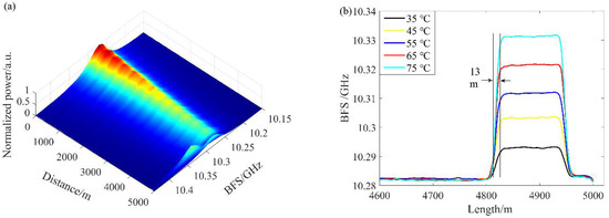 From the previous analysis and experimental verification, it can be seen that the proposed sensing structure has a strong SNR and bending resistance. Therefore, using the experimental system shown in Figure 5, we measured the temperature-sensing characteristics of SMF alignment fusion to the 50 μm GI-MMF. At room temperature (24 ℃), an approximated 150 m fiber near the far end of the 50 μm GI-MMF was heated from 35 ℃ to 75 ℃ at a step of 10 ℃. Three measurements were carried out at the same temperature, and the measured results were averaged by extracting the parameters of the Brillouin signal more accurately.