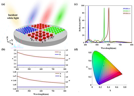 In nature, the wings of Morpho butterflies [1,2] and the feathers of peacocks [3,4] display vivid colors, known as “structural colors”, which are the result of the interaction of visible light with periodic nanostructured materials on their surfaces. Compared to conventional dye pigments, which are susceptible to optical damage and somewhat hazardous to the environment [5], structural-color-based pixels offer the merits of high resolution, good sustainability, and environmental friendliness. Thus, structural colors have become a fascinating field in science and engineering in recent years [1,6,7,8,9]. For artificial structural colors, methods based on Fabry−Perot (FP) cavity multilayer structure [10,11] and plasmonic nanostructures [12,13] have emerged in large numbers; however, there are still some challenges. Typically, the practical application of multilayer structures is still limited due to complex fabrication processes and durability and oxidation issues [14]. In addition, for plasmonic nanostructures, their reflection peaks are generally broad and less intensive [12,15] due to the inherent loss of metals in the visible region. Furthermore, although the approach of applying the metasurface concept to plasmonic metals boosts light–matter couplings [16,17,18], the intrinsic Ohmic losses still hinder their applications.