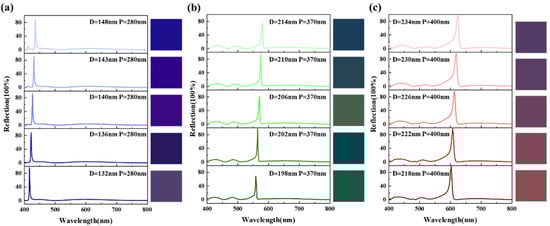 Simulated reflection spectra and structural colors. (a) Output colors for LNNDMRs at a period of 280 nm. (b) Output colors for LNNDMRs at a period of 370 nm. (c) Output colors for LNNDMRs at a period of 400 nm.