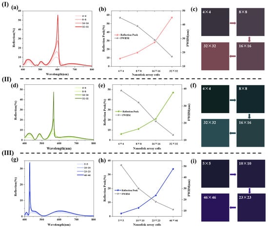Nanodisk array cells of LNNDMRs. (I) Dimensions: D = 218 nm, P = 400 nm: (a) Reflection spectrum at 4 × 4, 8 × 8, 16 × 16, and 32 × 32 array cells. (b) Reflection peaks and FWHM for different array cells. (c) Output colors with different array cells; (II) Dimensions: D = 202 nm, P = 370 nm: (d) Reflection spectrum at 4 × 4, 8 × 8, 16 × 16, and 32 × 32 array cells. (e) Reflection peaks and FWHM for different array cells. (f) Output colors with different array cells; (III) Dimensions: D = 140 nm, P = 280 nm: (g) Reflection spectrum at 5 × 5, 10 × 10, 23 × 23, and 46 × 46 array cells. (h) Reflection peaks and FWHM for different array cells. (i) Output colors with different array cells.
