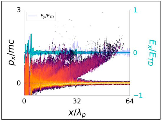 Electron phase space and field structure for a critical density case nc/ne = 1 and a laser pulse of length 8λp at a laser intensity a0 = 1. Data shows the buildup of a large population of low-energy accelerated electrons for a high-density plasma (from Nicks et al. [18]).
