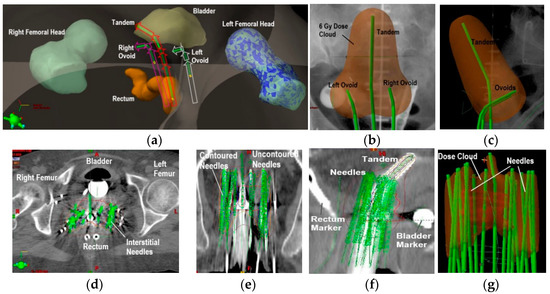 Three-dimensional computer rendering of a tandem-and-ovoids brachytherapy treatment generated from a patient’s CT scan. Femoral heads, bladder, and rectum structures are depicted. The arrows in the green structures indicate the radiation treatment is administered with the source at the most distal dwell position (or farthest inside the applicator) first per applicator channel (a). A calculated 6 Gy prescription dose distribution (pear shape) for a tandem-and-ovoids (green structures) is shown in a coronal (b) and sagittal views (c). Axial CT image depicting interstitial brachytherapy needles for cervical cancer treatment (d). Coronal (e) and sagittal images (f) are also shown. Depiction of a 6 Gy prescription dose calculated from the dose contribution of all the interstitial needle channels (g).