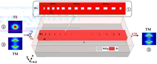 In photonics integrated circuits (PICs), the performances of polarization sensitive devices and systems are always limited to large birefringence []. In this case, there is a great demand to produce a polarization management device to perform polarization states manipulation in PICs. To date, a number of device structures have been reported to perform various polarization control functions, including polarization beam splitters (PBS) [,,], polarization splitter-rotators (PSR) [,,], and polarizers [,,]. Theoretically, the PBS and PSR require restrict phase matching conditions to realize splitting operations so their structural geometries have to be carefully controlled in design and fabrication. In contrast, the polarizer is a much simpler but effective device that eliminates the undesired polarization state by means of leakage, absorption, or reflection.