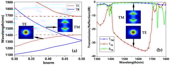 (a) The band structure diagram for both TE and TM polarization states; (b) The wavelength dependent transmittance and reflectance of TE and TM polarization states under the initialized device geometries. Inset: Mode profiles of TE and TM polarization states.