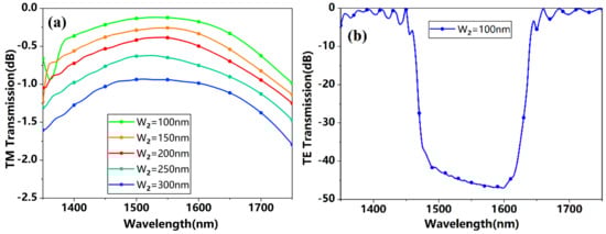 (a) The wavelength dependent transmittance of TM polarization state under various different slot width W2 from 100 nm to 300 nm; (b) The wavelength dependent transmittance of TE polarization state under W2 = 100 nm.