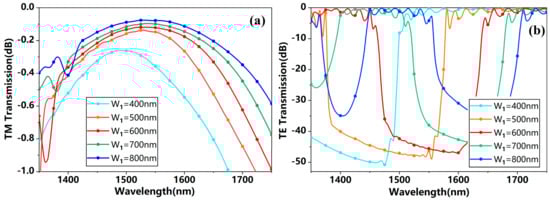 The wavelength dependent transmittances evaluated with various waveguide widths W1 for (a) TM polarization state and (b) TE polarization state.