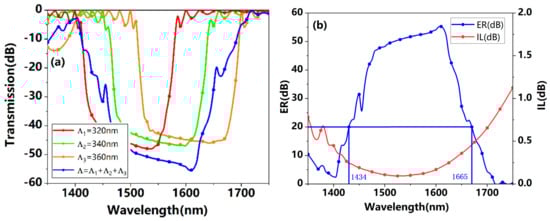 Figure 6a shows the wavelength-dependent transmittances under the grating periods of Λ1 = 320 nm, Λ2 = 340 nm, Λ3 = 360 nm, independently, and the superposition of the three kinds of grating periods. It is clear that the reflection wavelength band has a red shift as the period increases. Additionally, the neighbouring periods have an overlapped wavelength band and each period has its unique wavelength band. However, the final transmission spectrum by using multiple grating sections is not simply the superposition of the three independent wavelength bands. The reflectance in the overlapped wavelength band strengthened owing to the multiple reflections in all grating sections, but the remaining wavelength band weakened because it was only reflected in one of the sections. Nevertheless, the reflection wavelength range under the three grating sections has much broader operations than when using one single grating section. Taking account of the negative impact of reflections on the light source, it is better to have a non-reciprocal device in front of the polarizer, such as a circulator [] or isolator []. In Figure 6b, the ER and IL are determined using the simulated TE and TM transmittances under three grating sections. At 1550 nm, the extinction ratio and insertion loss are 51.6 dB and 0.09 dB, respectively. Additionally, under a device length of 15.3 μm, the polarizer achieves a relatively high ER of greater than 20 dB over the wavelength region from 1434 nm to 1665 nm. Meanwhile, the IL is always less than 0.42 dB within this wavelength region.