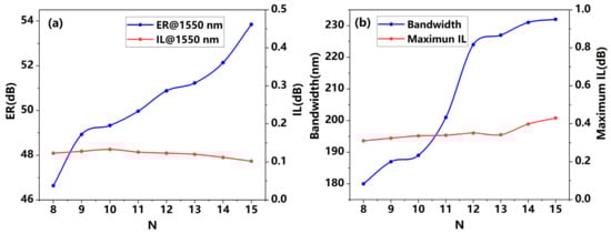 As a rule of thumb, the length of the polarizer has a considerable impact on the polarizer performance, such as ER and IL. With the assumption that the three grating sections have the same number of periods N, we tested the number of periods N from 8 to 15 and evaluated the corresponding ER and IL. As demonstrated in Figure 7a, the IL at 1550 nm for the TM polarization state was insensitive to the device length, and remained consistently around 0.1 dB. Over the entire wavelength region, the highest IL slightly increased from 0.3 dB to 0.4 dB, as shown in Figure 7b. In terms of ER, there was a significant increase along with the increased number of periods N, owing to the contribution of grater reflected TE power. In this case, the bandwidth increased along with the utilized number of periods. According Figure 7b, if the utilized number of periods increased from 8 to 15, the bandwidth also increased from 180 nm to 231 nm. However, when the number of periods N was greater than 12, the rise in the bandwidth rate slowed down dramatically. Hence, N = 12 provides a more compact solution (~12.2 μm) if a bit narrower bandwidth of 225 nm is achieved.