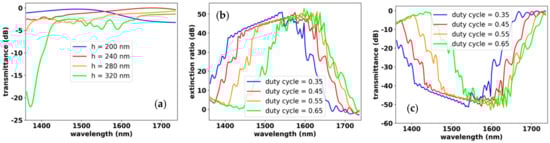 Apart from the above discussed device geometries, we also conducted a device performance analysis on device height h and grating duty cycle a/Λ. When the device height was set as h = 200 nm, the TM effective index decreased. Especially for the wavelength region longer than 1600 nm, the TM effective index was evaluated to be less than 1.6 and was too close to the SiO2 cladding refractive index. Therefore, there is a considerable loss in this wavelength region. As shown in Figure 8a, the estimated transmittance under h = 200 nm decreased to less than −3 dB at the wavelength region greater than 1600 nm. Conversely, when we set a higher device height, the TM effective index increased dramatically. In this case, under the previously determined grating periods, the TM polarization state at shorter wavelength region, e.g., <1450 nm, tended towards the Bragg region and suffered from a relative high loss due to the Bragg reflection. As demonstrated in Figure 8a as well, when the device height was set as 240, the transmittance at the wavelength region shorter than 1500 was less than −2 dB. Additionally, if we continue to increase the device height to h = 320 nm, the edge of the TM Bragg window appears at 1430 nm. Hence, as we determined, h = 220 nm is actually a good tradeoff in this proposed polarizer.
