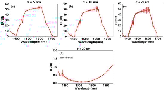Considering that the Bragg reflection is sensitive to the grating period and duty cycle, we performed a statistical analysis to characterize the device manufacturing tolerance []. In practice, random jitters are introduced in all grating ridges with a variance of σ = 5 nm, σ = 10 nm, and σ = 20 nm. Additionally, for each kind of jitter variance, ten independent realizations are modeled and simulated using 3D-FDTD calculation. The error bar of the evaluated ER under the three jitter variances are shown in Figure 10a–c. Obviously, for each ridge jitter variance, the ER has higher standard deviation in the wavelength region from 1470 nm to 1630 nm. Additionally, such ER fluctuations become more evident as the ridge jitter variance increases. Nevertheless, even in the worst case, the highest ER is greater than 40 dB and the bandwidth is broader than 200 nm. On the other hand, the IL fluctuation is negligible, so that it is always smaller than 0.5 dB over the wavelength region from 1390 to 1680 nm. Hence, the proposed polarizer is a high fabrication tolerant device.