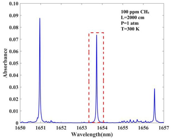 The absorption line of 100 ppm CH4 in the spectral range of 1650–1657 nm based on HITRAN database is depicted in Figure 1. The parameters for the simulation in the inset of Figure 1 are as follows: temperature T = 300 K, pressure P = 1 atm, and optical path length L= 2000 cm.