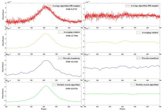 The denoising ability of the improved particle swarm algorithm is compared with that of the average algorithm, averaging window algorithm, and wavelet transform by calculating the SNR of the signal. As shown in Figure 7, the average algorithm shows the worst denoising ability, even though it improved the low SNR original signal by around 3.8349 dB, and with large sample size, the disturbance of interference fringes is still very serious. Based on the averaging algorithm, we used the averaging window algorithm. When the number of iterations was reasonable, the output signal was relatively smooth, and the signal-to-noise ratio was improved by 8.3578 dB. However, when the number of iterations was large, the peak will be weakened, which in turn affects the calculated concentration. By contrast, the wavelet transform was much more obvious, and the SNR was improved by about 8.6778 dB. Standing out from the above algorithms, our proposed particle swarm algorithm showed the best performance and the highest SNR. The SNR of the original signal was improved by about 17.235 dB. Our particle swarm algorithm can extract the concentration information from the original signal and eliminate the influence of white noise and interference fringes. The algorithm also had the function of smoothing the signal. The SNR calculated by the improved particle swarm algorithm was 4.17 times higher than the SNR of the original signal.