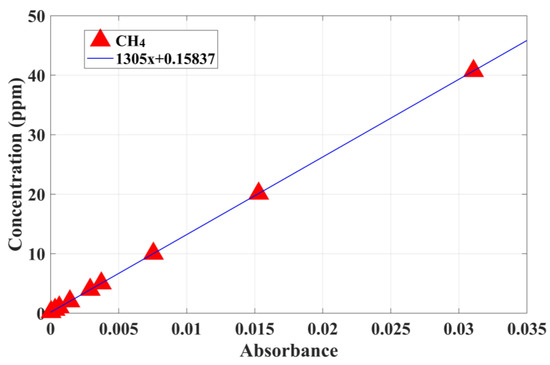 We configure the CH4 with different concentrations, the collected original spectra were processed by the improved particle swarm algorithm and then the peaks of absorption spectra were calculated, and a straight line was fitted according to the concentration and the peaks of absorption spectra, the expression of the straight line:
