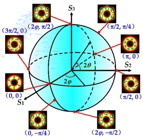 The polarization characteristic of the vector beam can be described by means of a high-order Poincaré sphere (HOPS) [26]. Figure 1 shows a typical schematic illustration of the HOPS with the topological charge l = 1, in which 2θ∈(−π/2, π/2) and 2φ∈(0, 2π) represent the polar angle and the equator angle of arbitrary points on the surface, respectively. As shown in Figure 1, on the equator, the points (2φ, 0) represent the cylindrical vector beams. Particularly, the points (0, 0) and (π, 0) correspond to the radially and azimuthally polarized beams, respectively [30]. The points that locate on the north (2φ, π/2) and south (2φ, −π/2) poles denote the left-handed and right-handed circularly polarized vortex beams, respectively. Other points on the surface represent the elliptical vector beams. In general, the vector beam with a polarization state on the HOPS can be generated by the superposition of two orthogonal circularly polarized vortex beams with opposite topological charges.
