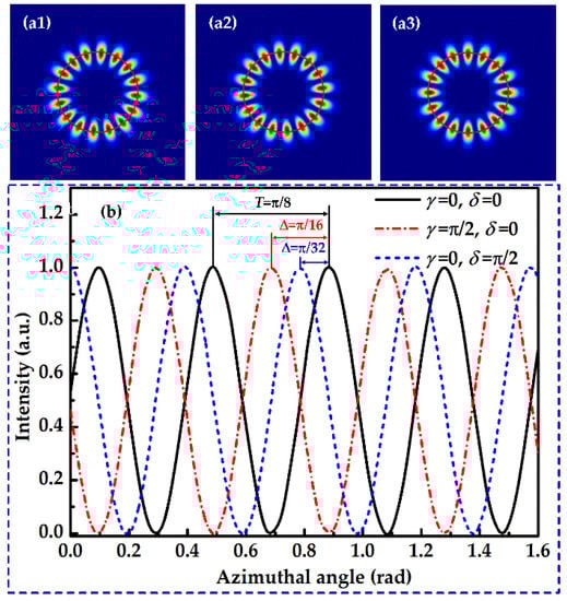 When the value of θ is set as θ = 0, the polarization of the vector beam is located on the equator of the HOPS according to Equation (5) and the cylindrical vector beam is generated. The simulated intensity distribution that the cylindrical vector beam with l = 8 passes through a linear polarizer (P2) are shown in Figure 3. When there is no phase retardation, the simulated results for the polarizer placed along the x-axis and y-axis are depicted in Figure 3(a1,a2), respectively. For the case that the phase retardation of SBC is π/2 and the polarizer is placed along the x-axis, the simulated result is presented in Figure 3(a3). It can be seen that the number of petals is 16, and the petal patterns rotate with the rotation of the P2 or the change of the phase retardation of the SBC. In Figure 3(a1–a3), the red cycles are obtained by fitting the centroid of each petal in the petal-like intensity patterns. The intensity distributions on the red cycles of Figure 3(a1–a3) are plotted as shown in Figure 3b, in which the results that correspond to the quarter of a period are demonstrated for manifesting the results more clearly. From Figure 3b, it can be seen that the angle between two adjacent petals in a petal pattern is π/8. When the orientation of the polarizer changes at an angle of π/2, the petals rotate at an angle of π/16. The rotation angle of the petals is π/32, when the phase retardation of the SBC is changed by π/2. The results agree well with the theoretical analysis in Equation (7).
