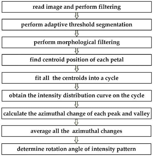 In order to obtain the rotation angle, the acquired images by the CCD are processed as the following procedure as shown in Figure 5. First of all, the petal images are read and preprocessed by performing the digital filtering to reduce the noise. Secondly, considering the nonuniform intensity distribution of the vector beam, the preprocessed images are binarized based on adaptive threshold segmentation, and the morphological filtering technique is employed to remove the small areas resulting from the impure radial components of the vector beam as shown in Figure 4. Thirdly, each petal is treated as the effective area to calculate its centroid location, and a cycle is obtained through fitting all of the centroids. Fourthly, the intensity curve on the fitted cycle of the petal pattern is plotted, and the peaks and valleys that distribute with the azimuthal angle are numbered, respectively. For the vector beam with the order 8, the number of peaks and valleys is 16. Then, the relative changes of the azimuthal angles of the peaks and valleys that correspond to the petal patterns before and after rotating are calculated. Finally, the rotation angle of the petal pattern is determined by averaging the entire relative changes of the azimuthal angles.