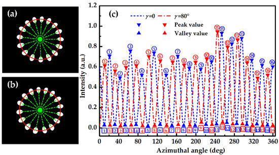 In order to demonstrate the image processing method more clearly, two images that are acquired in the experiment are processed and given as an illustration as shown in Figure 6. Following the image processing method shown in Figure 5, the processed images are given in Figure 6a,b, which correspond to the results before and after the polarizer (P2) rotating at an angle of 80°, respectively. The intensity distributions on the red cycles of Figure 6a,b are plotted in Figure 6c, in which the blue line and the red line represent the results before and after P2 rotating. To calculate the rotation angle of the petal patterns, the peaks and the valleys of the intensity curves for the same petals before and after rotating are all marked using the same number to be identified. Through calculating the relative movement of the peaks with the same number and the relative movement of the valleys with the same number, the rotation angle of the pattern can be determined with improved precision by averaging the 32 sets of data.