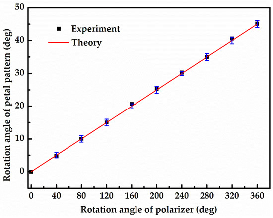 From Equation (7), it is easy to find that the transmitted intensity distribution is modulated by a sine function. So the transmitted intensity will satisfy the petal-like distribution, and there are 2|l| pieces of intensity petals in the captured images by CCD. In addition, when the orientation of the polarizer (P2) or the phase retardation of the SBC is changed, the petal will rotate around the center. Meanwhile, the rotation angles of the petal are 1/|l| and 1/(2|l|) times compared with the change in orientation of the P2 and the change of the phase retardation of the SBC, respectively. Based on these analyses, the phase retardation characteristic of the SBC can be measured, and the feasibility of the proposed scheme can be verified by measuring the certain rotation angles of the polarizer.